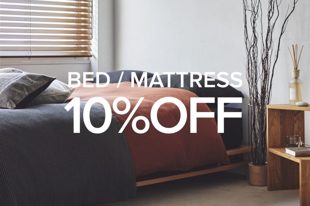 寝室を心地よく整えるベッド&マットレスや、空間を彩るラグ、窓辺にぴったりのカーテン・ブラインドまで、10%OFFでご注文いただけます。