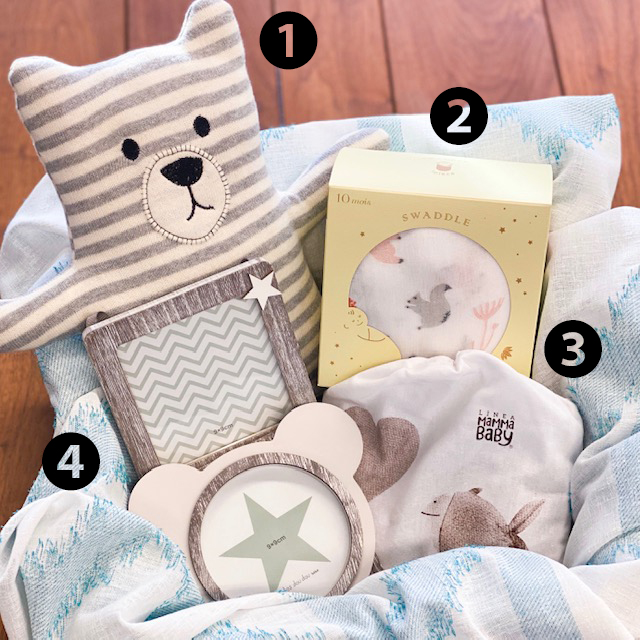 新生児に必要なシャンプーやおくるみと、幼少期から使えるTAK.の食器SETなど盛りだくさん!