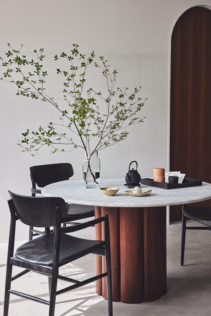 新作KORAは、NATADORAとアクタスが共同で開発したオリジナルのダイニングテーブルです。木の皮を継いだような一本脚のデザインと円形大理石の天板が象徴的で、一度目にしたら忘れられないデザインです。KORAとは、このテーブルをデザインしたPatryk Kocaの母国であるポーランド語で木の皮という意味。木と大理石、2つの素材それぞれが持つ美しさをたっぷり味わえるデザインです。