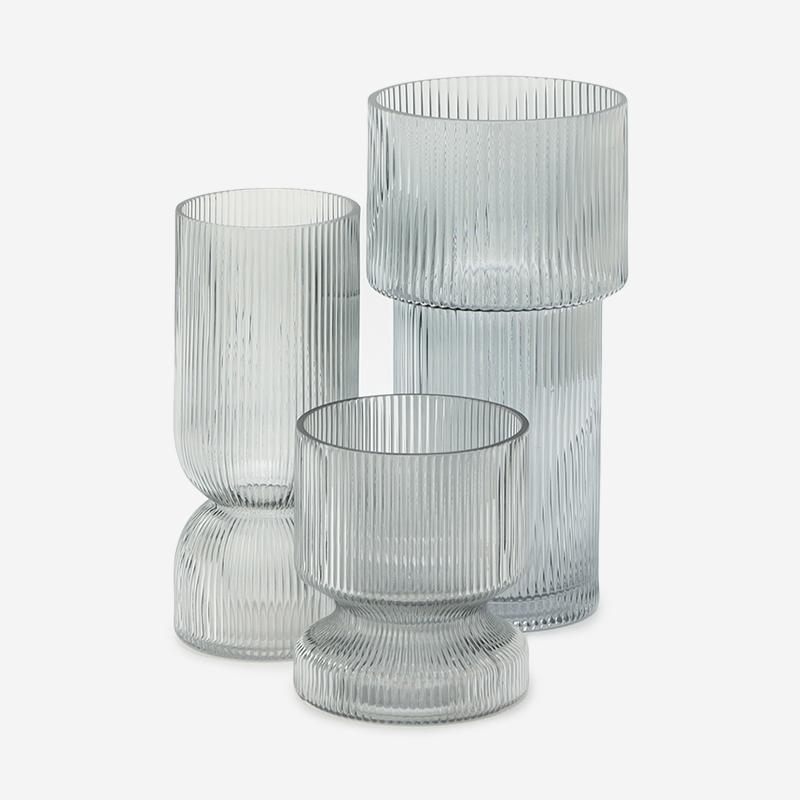 縦に細かく入ったラインが印象的なフラワーベース。光を通すと陰影がきれいです。それぞれ違うフォルムながら並べておくとディスプレイ映えする3サイズ展開。