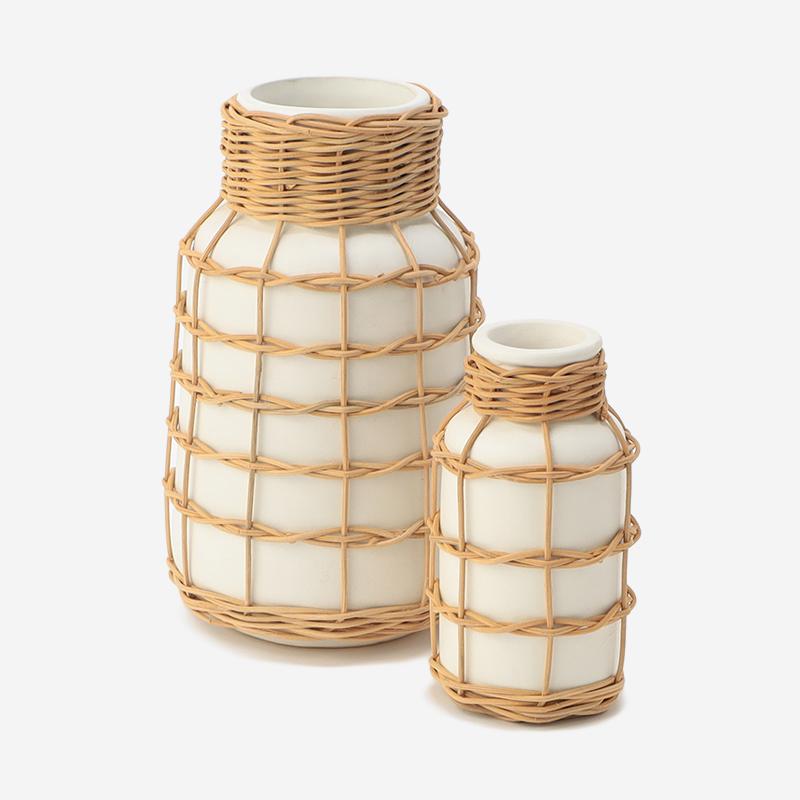 シンプルなホワイトのセラミックベースに天然素材のラタンを編み上げた職人技が光る逸品。インテリアのトレンドの一つ「プリミティブ」を天然素材で表現するアイテムです。