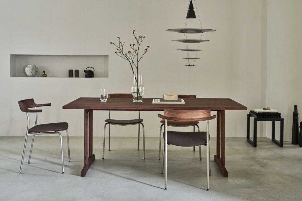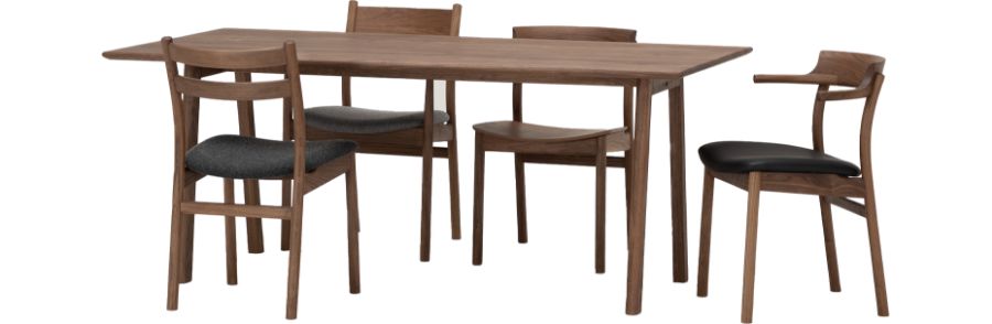 テーブルはオークとウォールナットの無垢材。長方形と円形の天板と3種のレッグデザインがお選びいただけます。チェアもカスタマイズ可能で、背もたれのデザインや木材・塗装、座面と、豊富な種類のバリエーションで自分好みにカスタマイズが可能です。