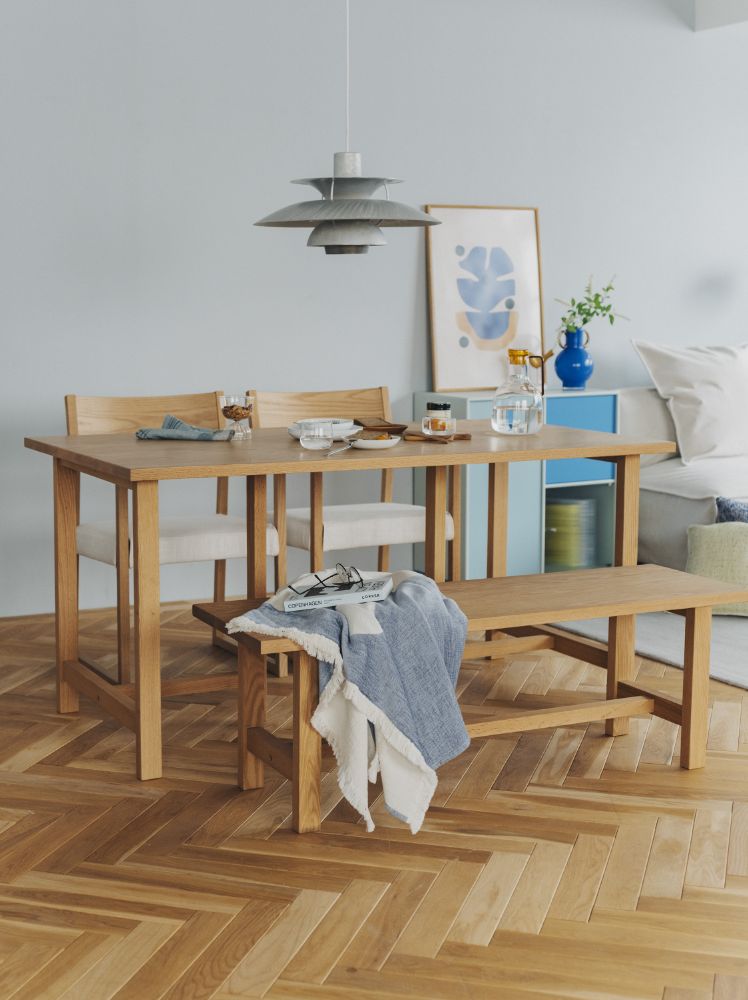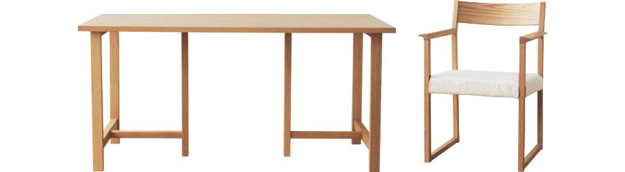 直線的なシャープなデザインと、無垢材を使った温もりが味わえるダイニングシリーズです。安定性の高いT字脚のテーブルは、マットな塗装でナチュラルな風合いをお楽しみいただけます。アーム付きのチェアは座り心地が良く、カーブを描いた背もたれが背中にやさしくフィットします。