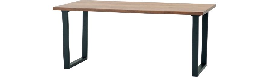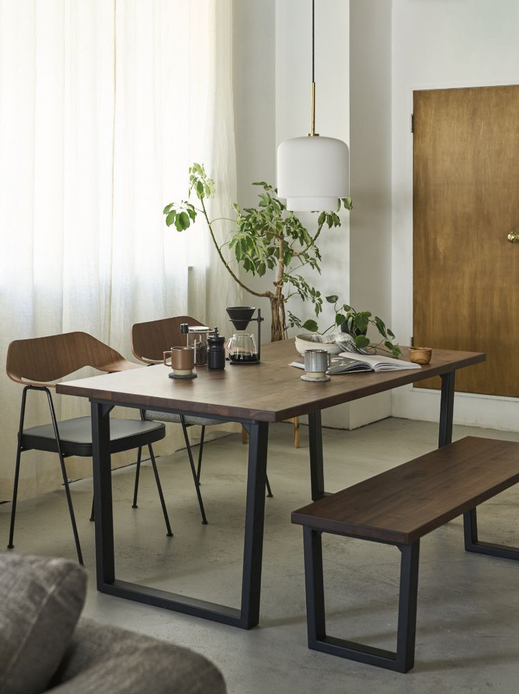 テーブルは3.5cmという厚みのある天板と、ブラックカラーのスクエアレッグの組み合わせが特徴です。天板は木の素材感を生かし薄いウレタン塗装で、レッグは金属のようにも見えるマットな仕上げ。傷が付いても目立ちにくい点も魅力です。
