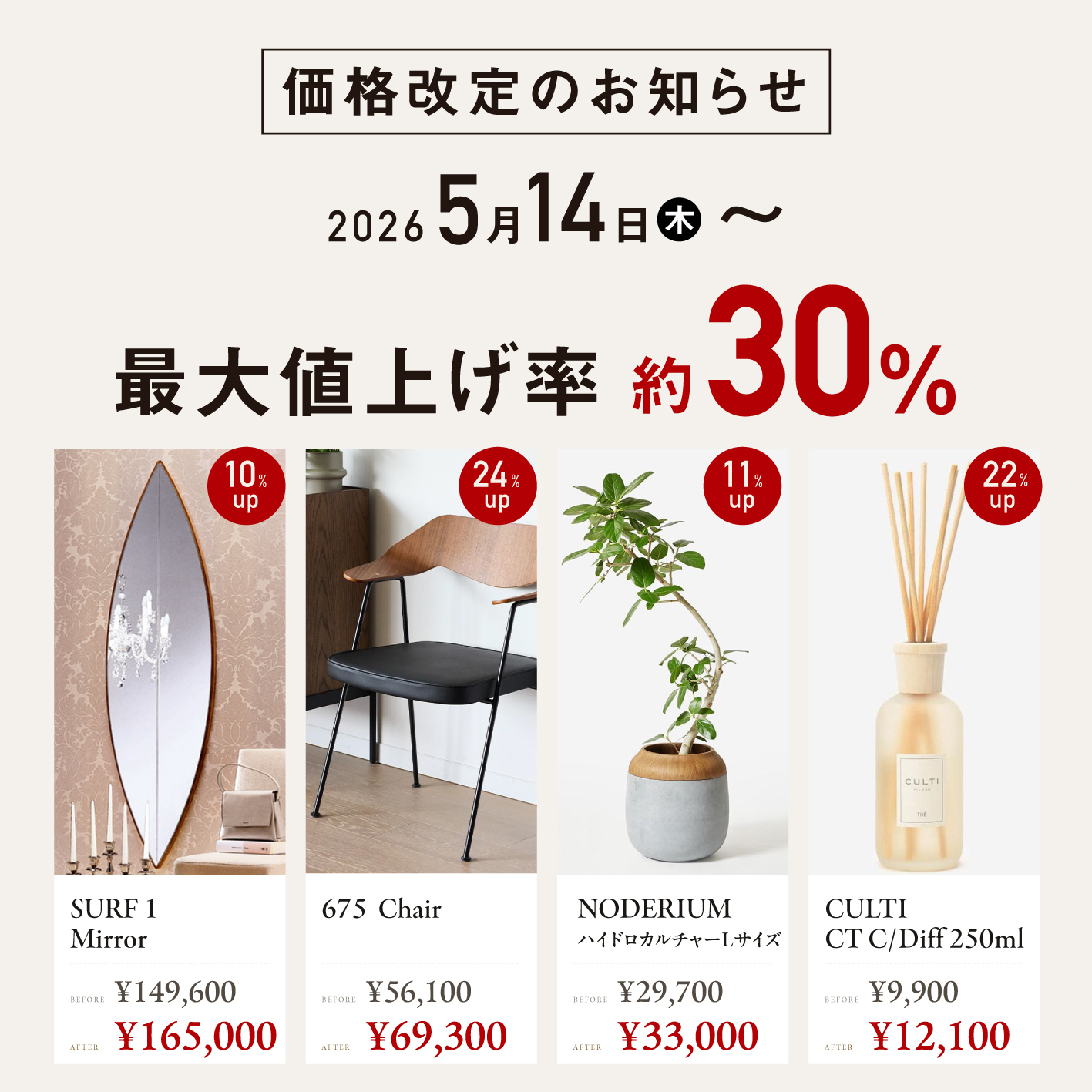 価格改定のご案内 平素はSTYLEをご愛顧賜りまして、誠にありがとうございます。 この度、昨今の原材料費や物流コストの高騰に伴い、2026年5月14日(木)に、取り扱い海外ブランドおよびオリジナルシリーズ家具、雑貨を対象とした価格改定を行います。予めご了承くださいますよう…