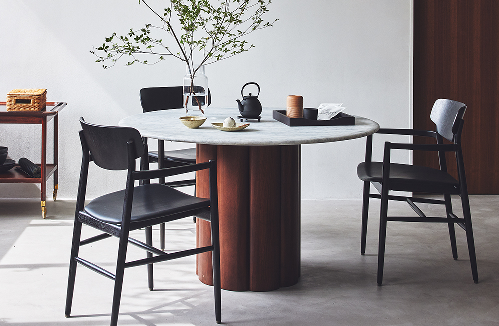 シンプルで上質な佇まいが魅力のKORAシリーズ。お部屋に合わせて天板の種類や脚の素材を選べ、永く使い続けられるダイニングテーブルです。