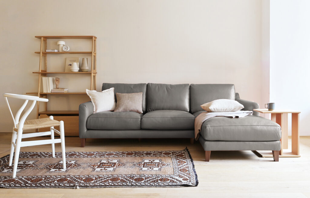 軽快でコンパクトなデザインが人気のレザーソファ。柔らかなクッション性で身体をしっかり支え、くつろぎやすいモデルです。